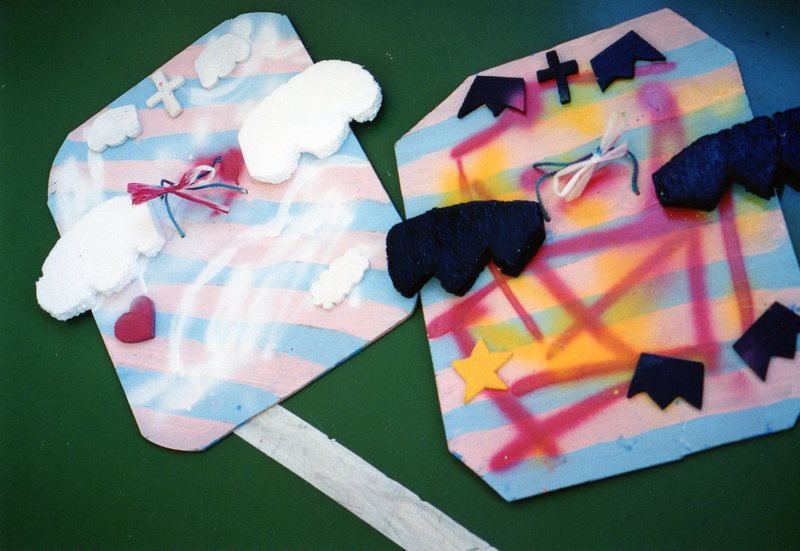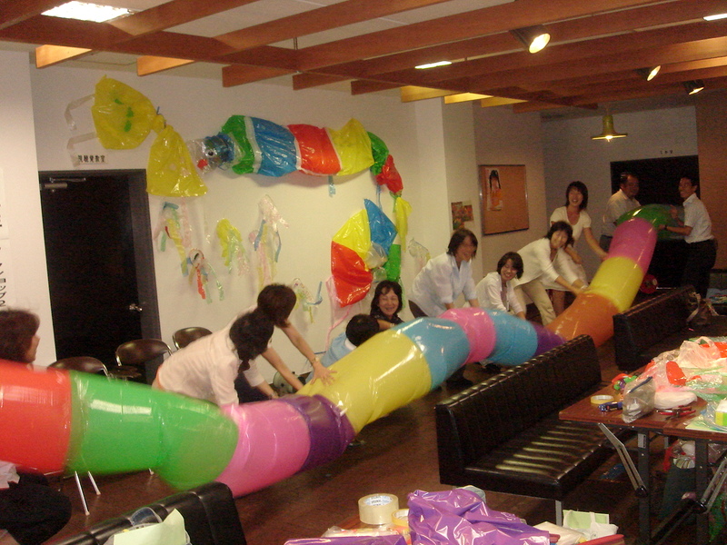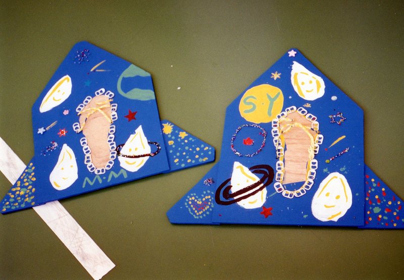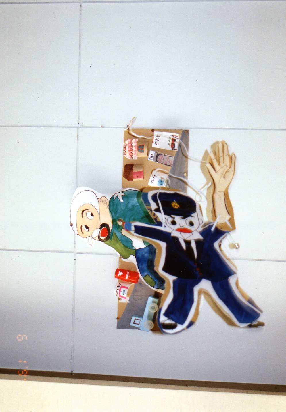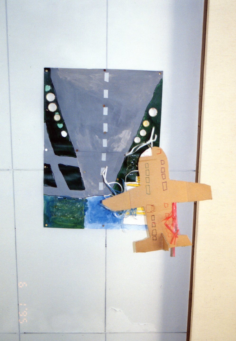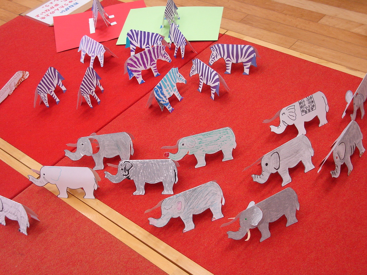 天井に絵を貼って、そこから垂らした衣料ゴムに関連物を取り付けてビヨーン。絵と関連のものが合わさるときが面白い。空に滑走路があって、そこへ向かって飛行機が着陸?…逆転の発想を子どもに伝えてうなずくときが実に嬉しい。
