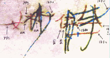 | これらの文字も二条線が現れているから万年筆またはペンで書いている。脅迫状にも、万年筆で書かれ、消された文字があったのである。 |