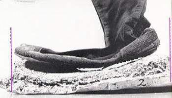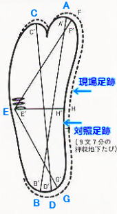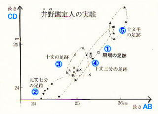 | 鑑定では、まず、警察が石川さんに家から押収した地下タビをはかせて (非常にきつかった) 作った足跡14個と警官がはいて作った足跡16個の、合わせて30個の足跡と現場足跡の長さを比較した。 |
