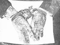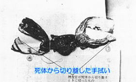 | しかも、手拭いで後手にというが、手拭いの片方の端で片手を縛り、もう一方の端で残りの片手を縛り、それを真ん中で結び合わせるというおそろしく複雑な縛り方がなされている。ちょっとでも抵抗されれば絶対にできない。死後に縛られたとしか思えないのだ。 |