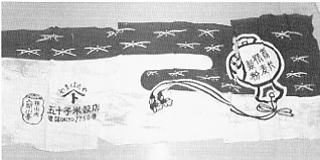 | タオルは、東京の月島食品工業が1959年~1962年に得意先に配布した8434本のうちの1本である。手拭いは、五十子米穀店が1963年の正月の年賀用に配った165本のうちの1本だった。 |