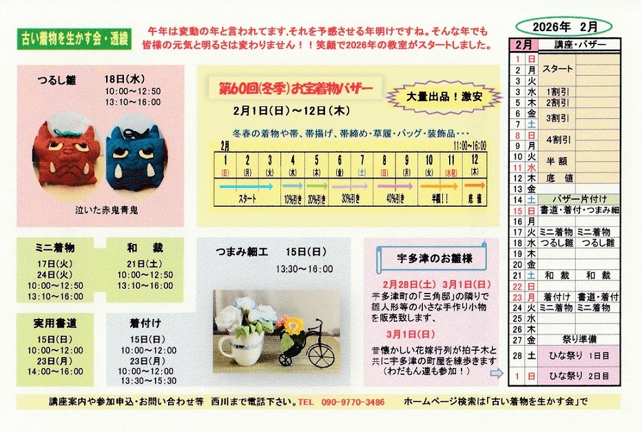 「古い着物を生かす会・透綾」では、手作り講座やイベント等を開催して、古い着物を❝生かす❞事に取り組んでいます。 講座は8種類あり、忙しい方でも参加出来る1回参加OKの❝お気軽講座❞が特徴です。