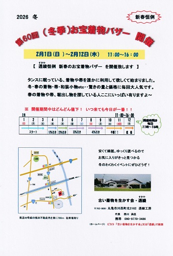 | お宝着物バザー 年間の開催予定日 冬季バザー 2月1日~12日 冬・春の着物や帯等 初夏バザー 6月1日~12日 単衣・夏の着物や帯 各種雑貨 秋季バザー 10月1日~12日 秋・冬の着物や帯 ハギレ・手芸品等 |
