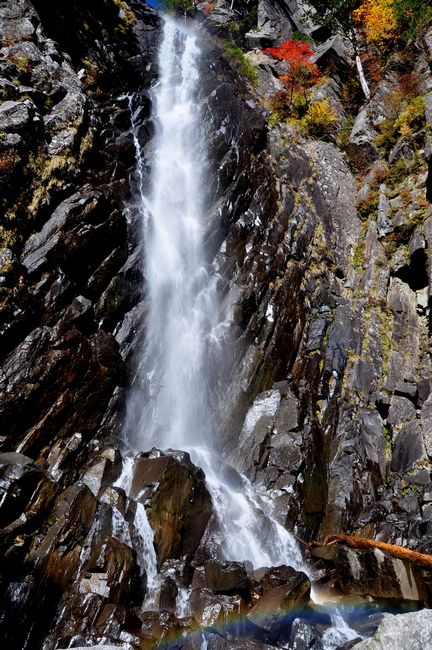 御来光の滝の上の青空と、滝壺の虹が、紅葉に映えていた。