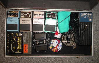 これだけペダルは所有しておりますが、彼は最近アンプ自体で音を作ることを心がけているため、現在コーラスとリミッターぐらいしか使用していないようです。