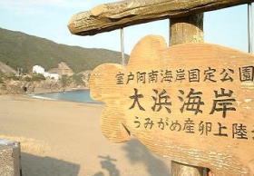徳島県の南部に位置する阿南海岸の一つ、大浜海岸。阿南市の蒲生田岬とならんでウミガメの産卵地として有名である。美しい景観を望めるこの海岸で神秘的なウミガメの産卵が見学できるのだ。私も学生の時、毎年産卵を見に来て感動的な産卵とウミガメの涙を見ることができた。しかし、近年では海水の汚染と海水温の上昇によりウミガメの上陸数が激変している。92,93年をピークに減少し、かつては100頭を超えての上陸数が2000年では24頭、これからも減少が進むと考えられ、さらなるウミガメの保護活動に期待したい。
