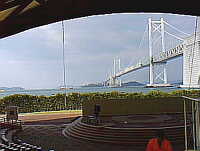 ここ瀬戸大橋記念公園には瀬戸大橋を展望できる展望台の他、たくさんの見所がある。まず、入り口には瀬戸大橋をイメージした噴水である。(写真右)結構迫力あります。その他、ゆったりくつろげる芝生広場、くぐり滝、野外ステージ(写真左下)など広い公園内をゆっくりとまってみよう。結構意外なものがあったりして・・・。