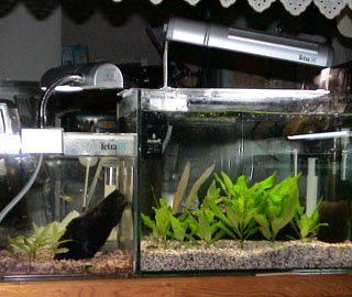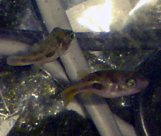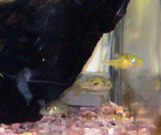| こんな感じで2つの水槽を並べています。 | 第4水槽には、アベニー・パファーという淡水ふぐが泳いでいます。 冷凍の赤虫以外食べてくれないので、結構面倒くさいです。 |