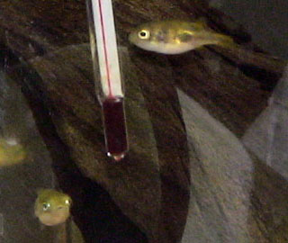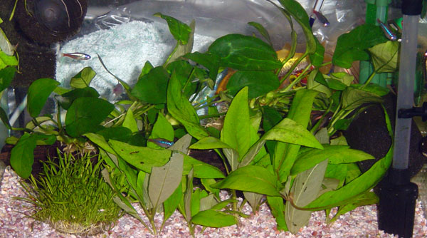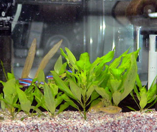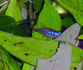 | 水草の陰に隠れてばかりでしたが、最近出てくるようになりました。 | ゴールデンネオンテトラですが、カージナルと混ざるとわかりません。 |