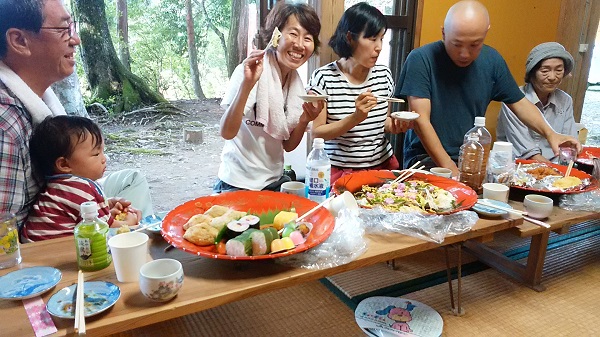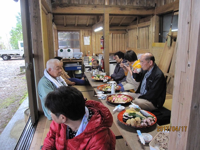 | 御大師山の88カ所をお参りし、本堂での接待を受け、午前中の大雨が嘘のように晴れ上がり、 温かい日差しの中で昔話に花を咲かせていました。 |