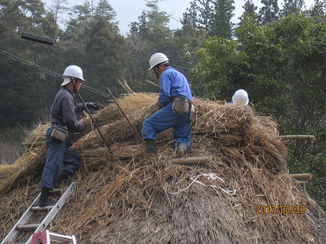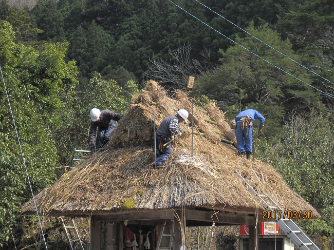 早速20017年3月30日 3人の職人さんが来られて 早速 取り掛かり、古いカヤを取り除き、新しいカヤと交換 20017年3月30日 完成 |